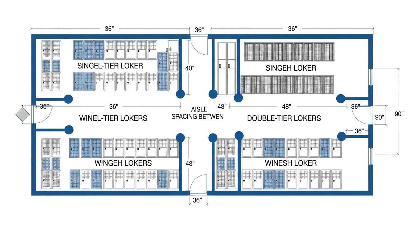 - Wall-to-wall clearance — You need a minimum 36" aisle between facing locker runs to satisfy most building egress requirements.