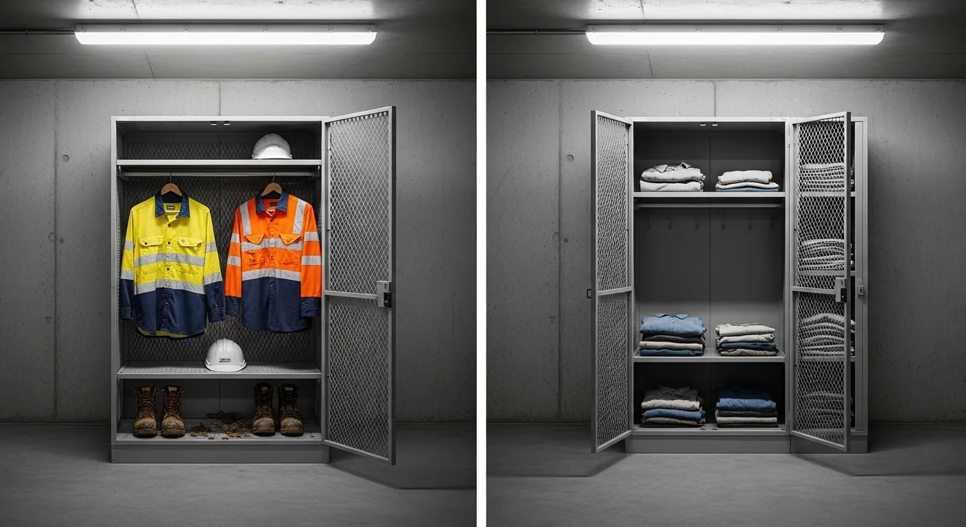 For most mining changerooms, mesh lockers are preferred because they allow continuous airflow — critical for damp gear and PPE — and allow visual security inspections without unlocking. Solid-door lockers offer greater privacy and suit items requiring secure or concealed storage. Many mine sites use both types depending on the locker room zone.